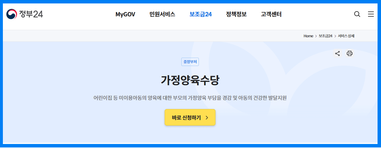 어린이집을 이용하지 않고 가정에서 양육을 하시는 부모님들의 부담을 덜어주고 아동의 건강한 발달을 지원하기 위해서 국가는 가정양육수당을 제공하고 있습니다. 간단하게 신청하면 혜택을 받을 수 있으니 미루지 마시고 신청하시기 바랍니다.