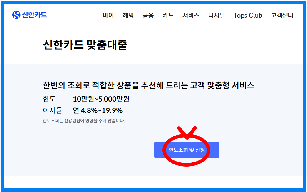 ▶ 이자율 연 4.8%에서 19.9%로 한도 10만원에서 5,000만 원까지 대출가능한 신한카드 대출상품 중에서 나에게 맞는 상품을 파악하여 추천해 주는 서비스를 말합니다.