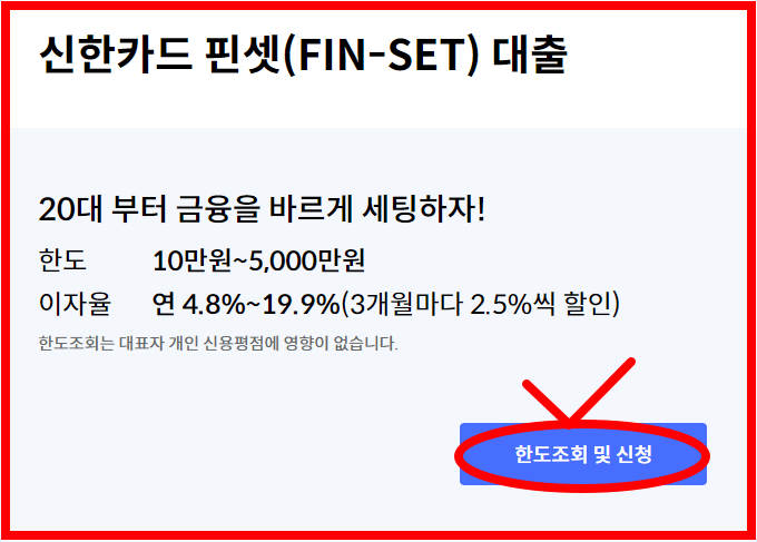 바로, 신한카드 핀셋(FIN-SET) 대출이라는 상품입니다. 대출은 한번 하고 나면 돌이킬 수 없죠. 그래서 20대부터 금융을 바르게 세팅하자는 취지로 만든 상품이라 금리가 저렴하여 믿을만하겠습니다.