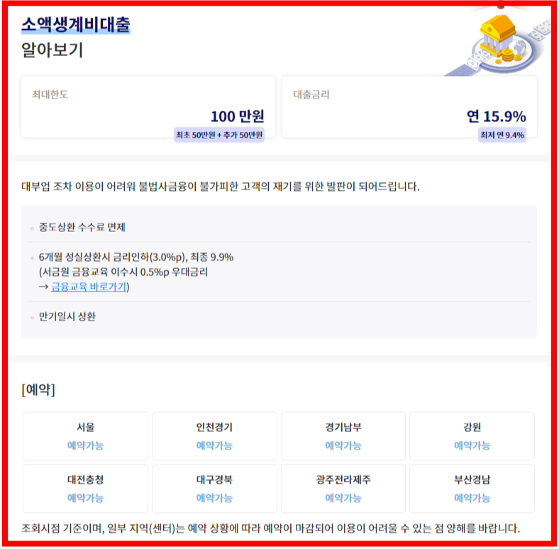 ▶ 전국 46개 서민금융통합지원센터 직접방문을 통해 대출상담 및 신청이 가능하며, 서민금융콜센터 국번없이 1397을 통해 서민금융통합지원센터 방문예약 가능합니다. 간편하게 신청할 수 있도록 아래 링크를 남겨놓을 테니 클릭하셔서 예약진행 하세요.