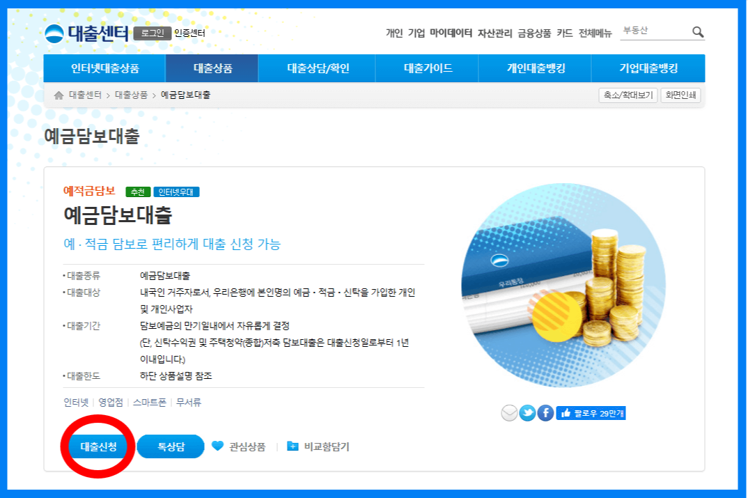 우리은행 예금 적금 담보대출 추천 상세 보기