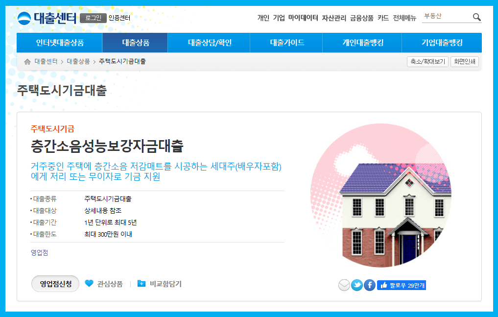 ▶ 거주중인 주택에 층간소음 저감매트를 시공하는 세대주(배우자 포함)에게 저리 또는 무이자로 기금 지원해 주는 상품이며, 대출기간은 1년 단위로 최대 5년이며, 대출한도는 최대 300만원 이내입니다.