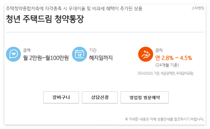 최근 관심이 많아진 상품이죠. 주택청약종합저축에 자격충족 시 우대이율 및 비과세 혜택이 추가된 상품인 청년 주택드림 청약통장에 대해서 소개해드리도록 하겠습니다. 금액은 월 2만 원에서 100만 원까지이며, 기간은 해지일까지, 금리는 연 2.8%~4.5%이니 참고바랍니다.